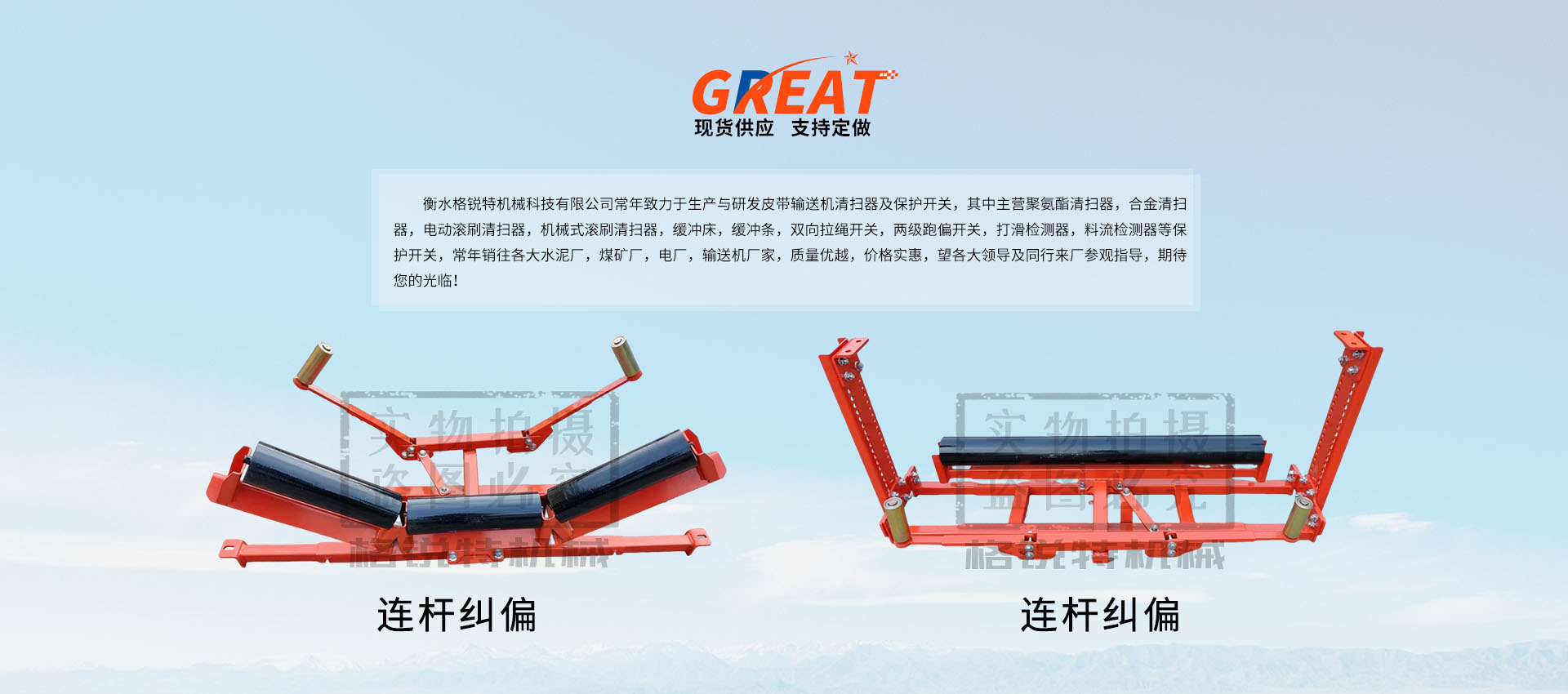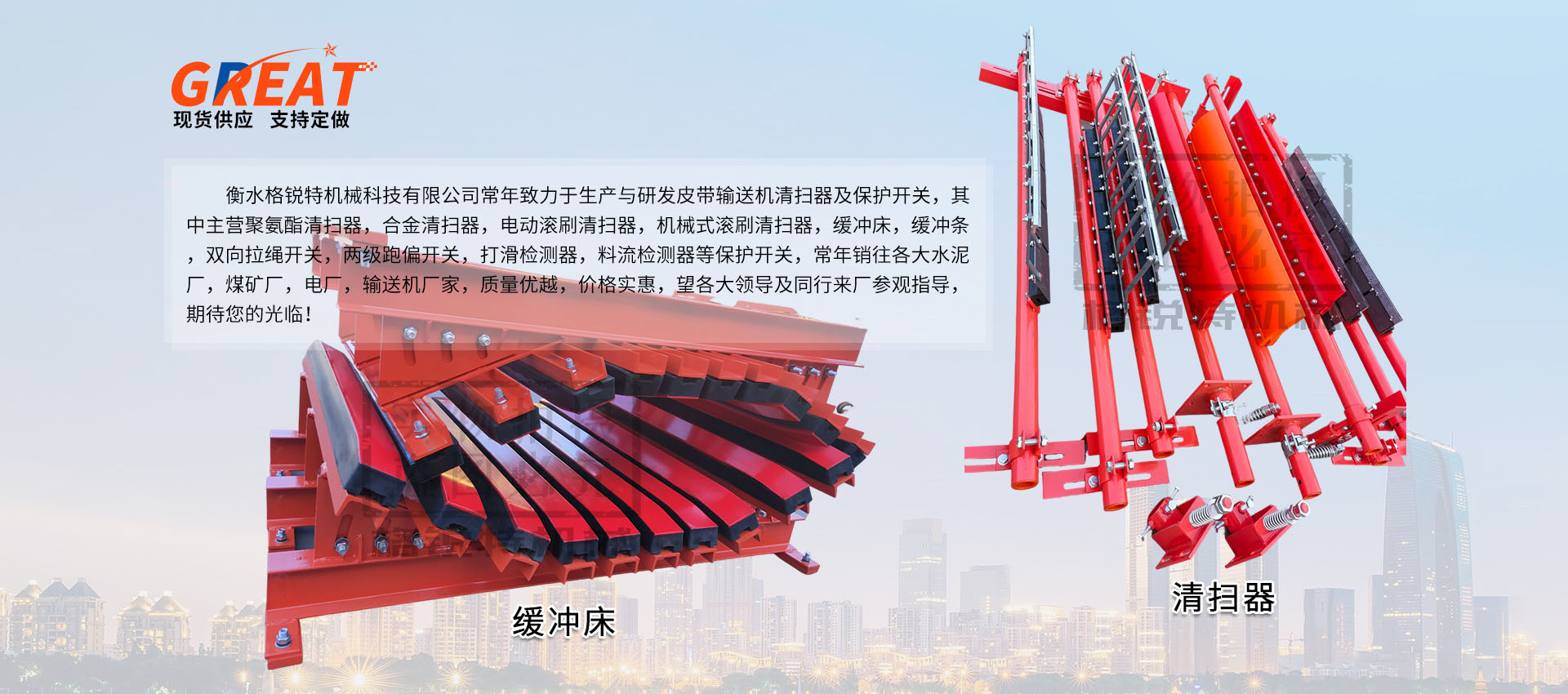 衡水格銳特機械科技有限公司常年致力于生產(chǎn)與研發(fā)皮帶輸送機清掃器及保護開關,其中主營聚氨酯清掃器,合金清掃器,電動滾刷清掃器,機械式滾刷清掃器,緩沖床,緩沖條,雙向拉繩開關,兩級跑偏開關,打滑檢測器,料流檢測器等保護開關,常年銷往各大水泥廠,煤礦廠,電廠,輸送機廠家,質(zhì)量優(yōu)越,價格實惠,望各大領導及同行來廠參觀指導,期待您的光臨!!!